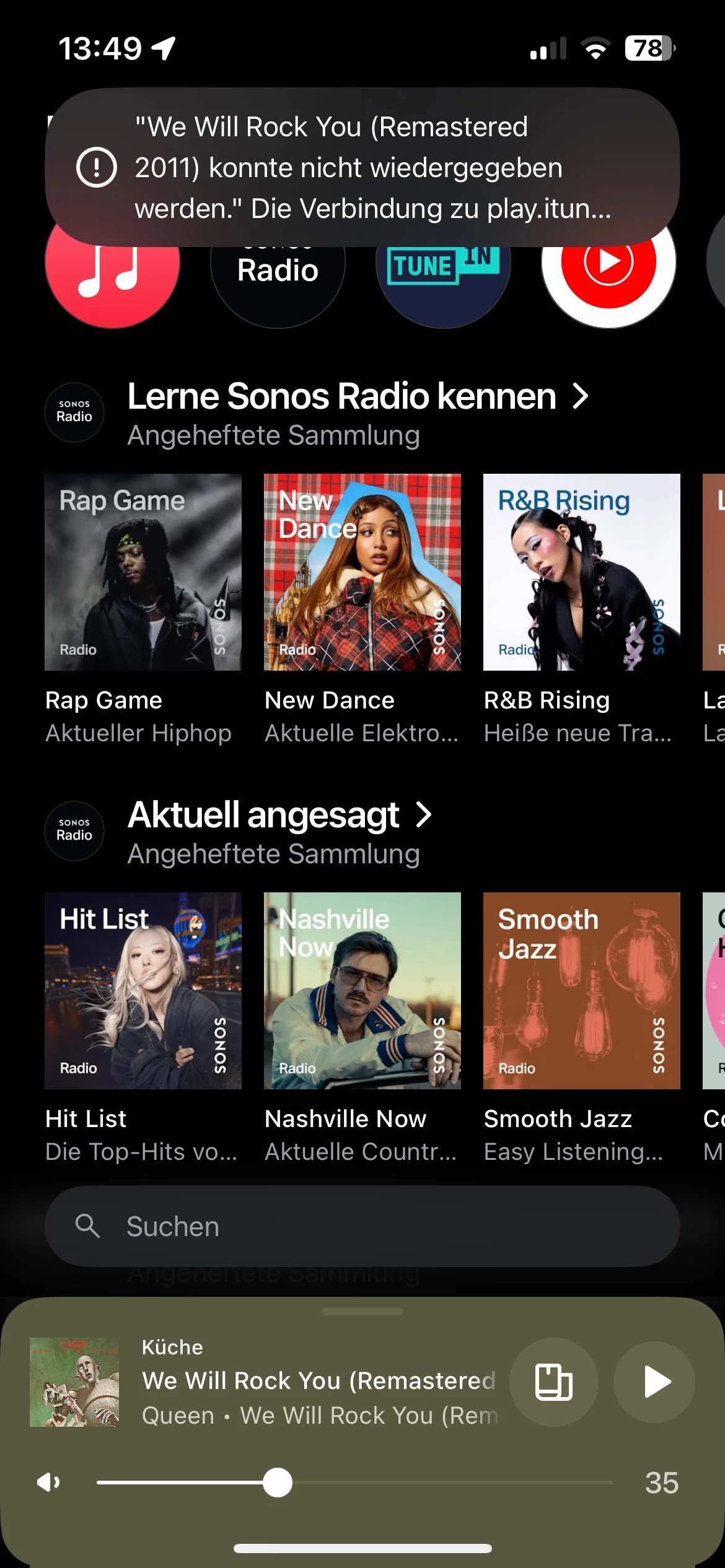 Wenn ich der Box den Befehl gebe “Alexa, spiele Queen” erhalte ich die Bestätigung “Queen wird von Stefan´s Apple Music abgespielt”. In der App sehe ich auch, dass versucht wird Queen abzuspielen und ich erhalte in der App folgende Fehlermeldung.