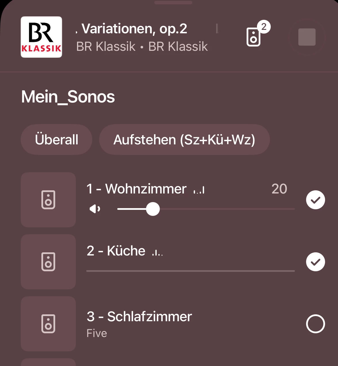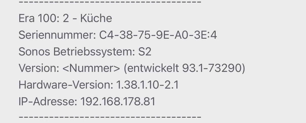 Seit heute kann ich bei einem Sonos-Lautsprecher die Lautstärke nicht mehr einstellen. Lautsprecher spielt. App auf einem anderen iPhone in der Familie zeigt den Regler! Neustart der App, selbst Neuinstallation hat nicht geholfen. Eine Beobachtung: keine Versionsnummer für den Lautsprecher in den Systeminfos. S.u.