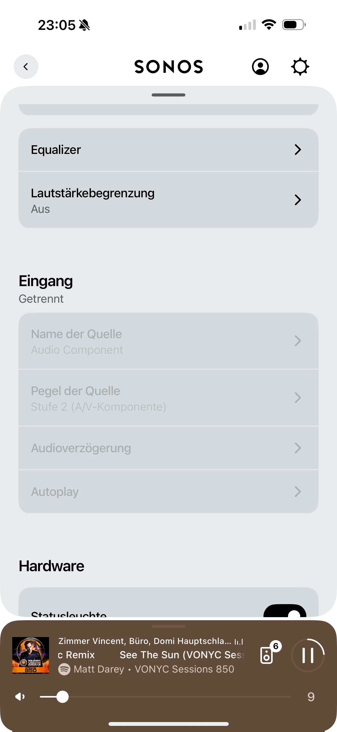 • In der App erscheint statusmäßig „Eingang getrennt“ bei diesem Raum, die Optionen zur Auswahl einer Quelle sind ausgegraut oder nicht verfügbar.