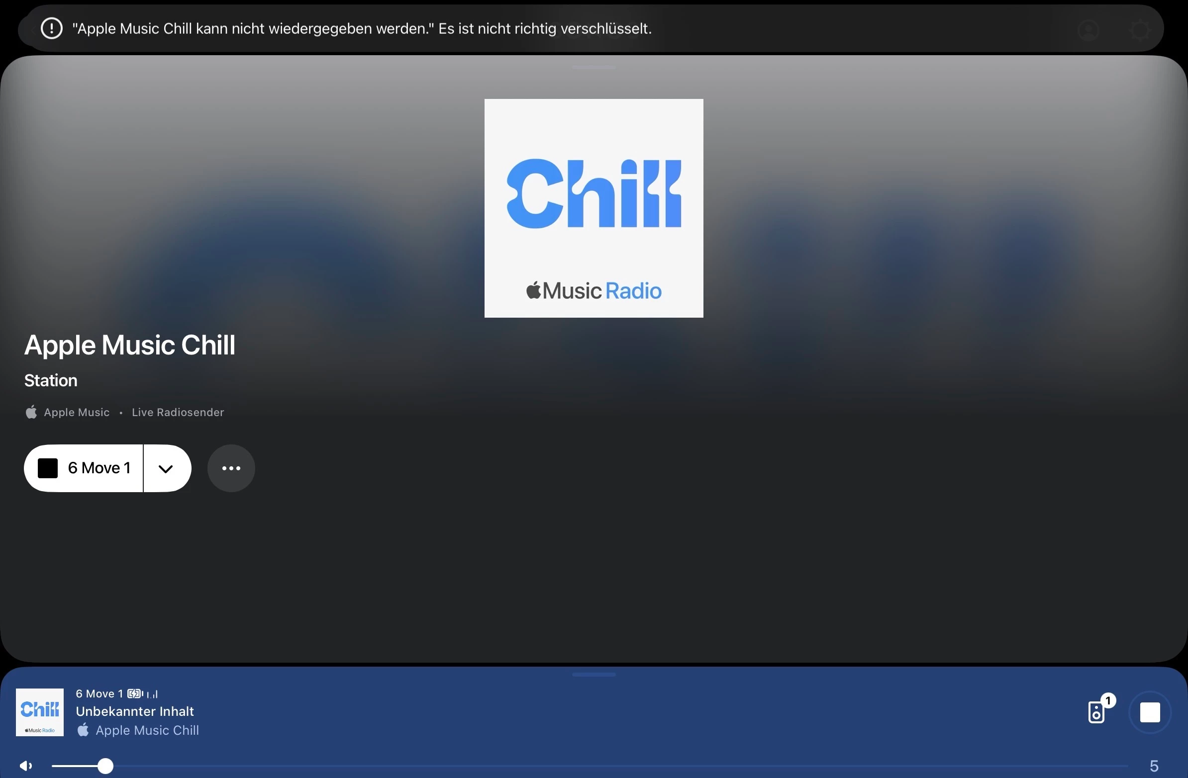 seit einiger Zeit lässt sich der Radiosender Apple Music Chill nicht mehr über die Sonos App starten. Es kommt eine Fehlermeldung mit fehlender Verschlüsselung.