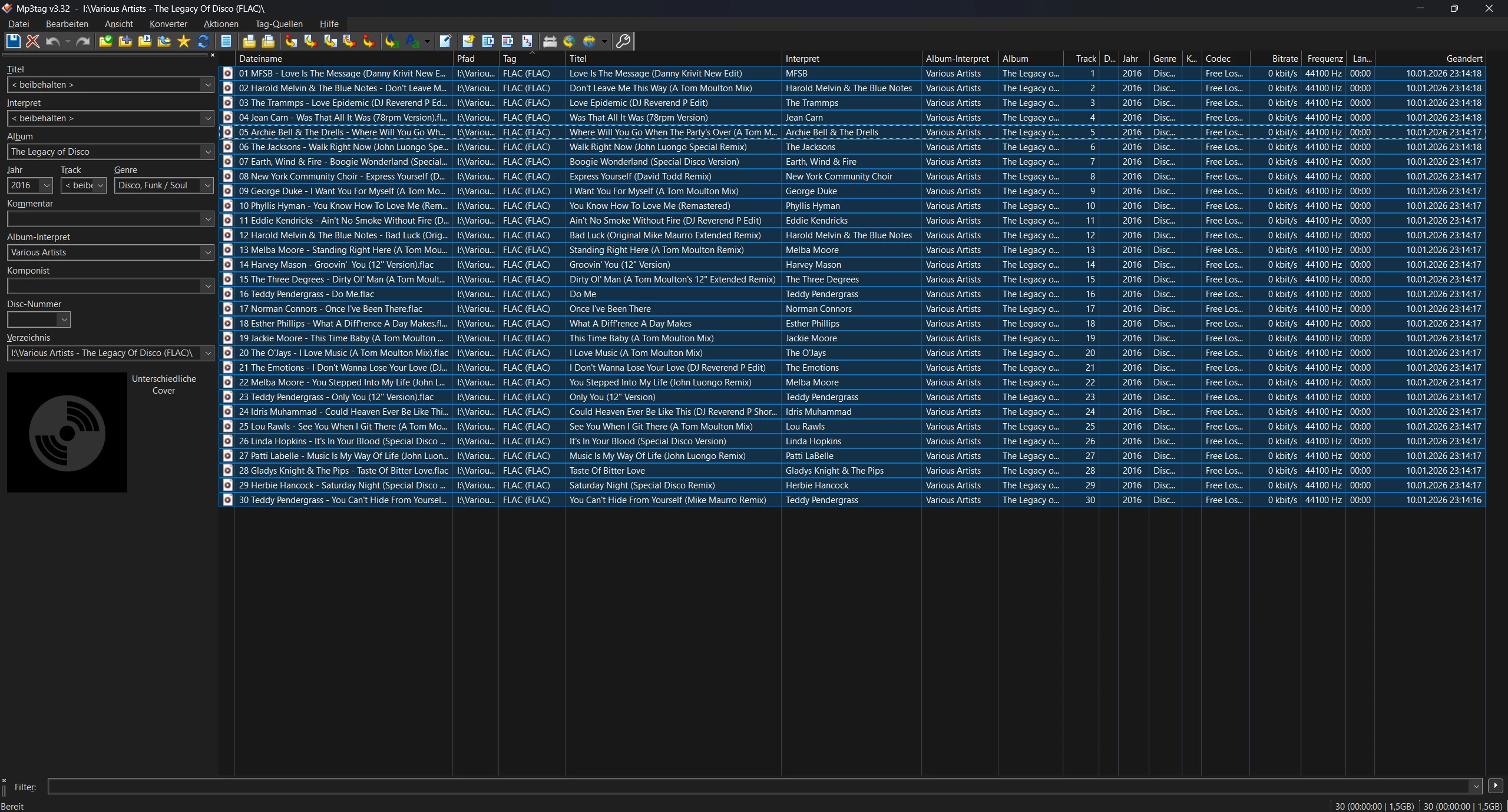 Und die Ordnerstruktur spielt ebenfalls keine Rolle bei der Berücksichtigung der Metadaten. Selbst über verschiedene Ordner (z. B. CD1 und CD2) verteilte Datein werden bei einheitlichen Album Metadaten zusammengefasst.