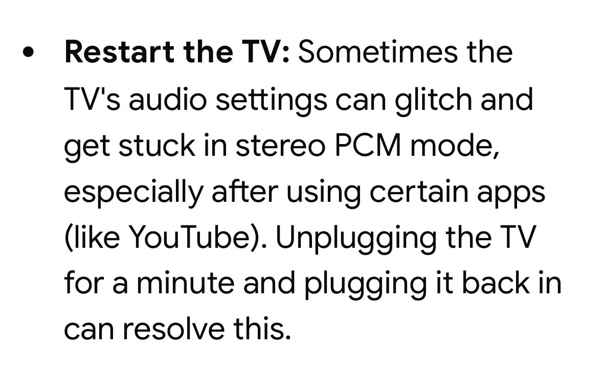 Der TV ist unter der Audioausgabe/Format auf Automatisch und/oder Bitstream gestellt.