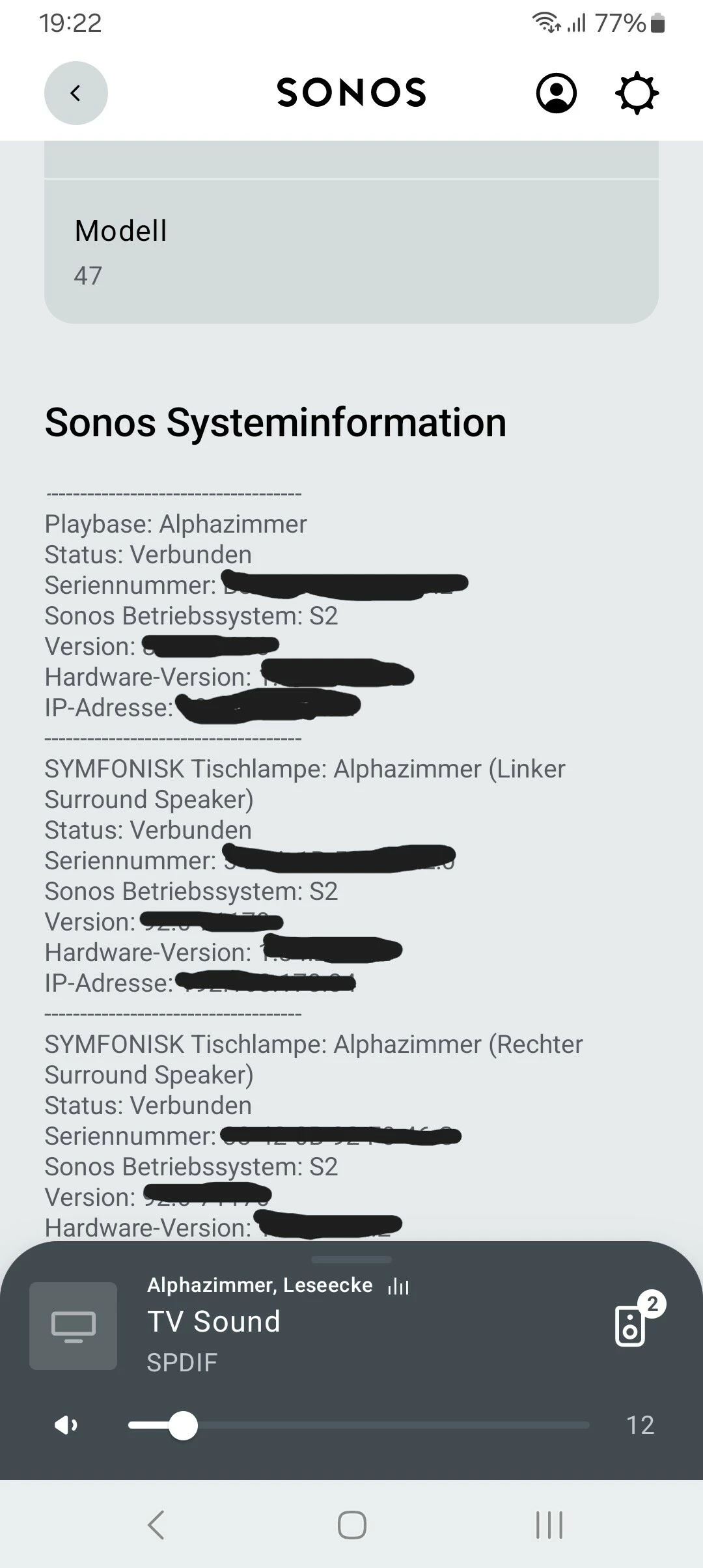 Nachdem wir mit dem Support bereits alle üblichen Fehlerquellen wie HDMI-Kabel, App-Version, iOS Version, TV-Einstellungen etc. ausschließen konnten, konzentriert sich das Problem nun auf die SONOS App bzw. die Firmware. Darum sollte ich dort die Werte zu “Über dein System” übermitteln. Und siehe da: unter iOS sind diese unvollständig. Es fehlen die WM-Werte, die Serien-ID und der erkannte Audioeingang.