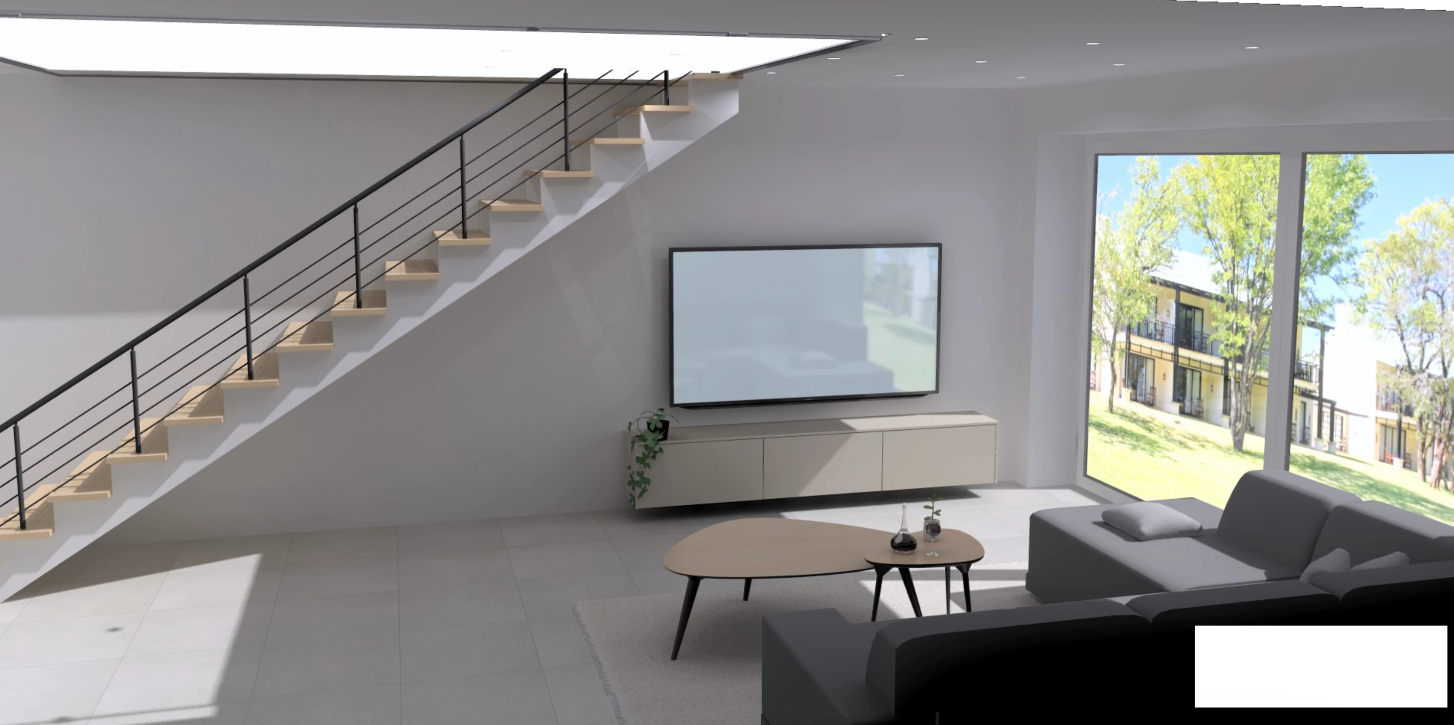 In diesem Raum wird es eine Küchenzeile und einen wandhängenden Fernseher mit Kabelkanal geben.