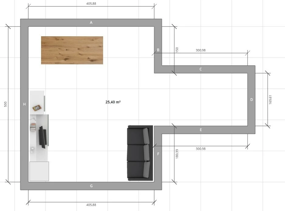 Ich mache mir da gerade viele Gedanken. An der Wand B entlang nach oben geht der Flur los, was hier nicht eingezeichnet ist.