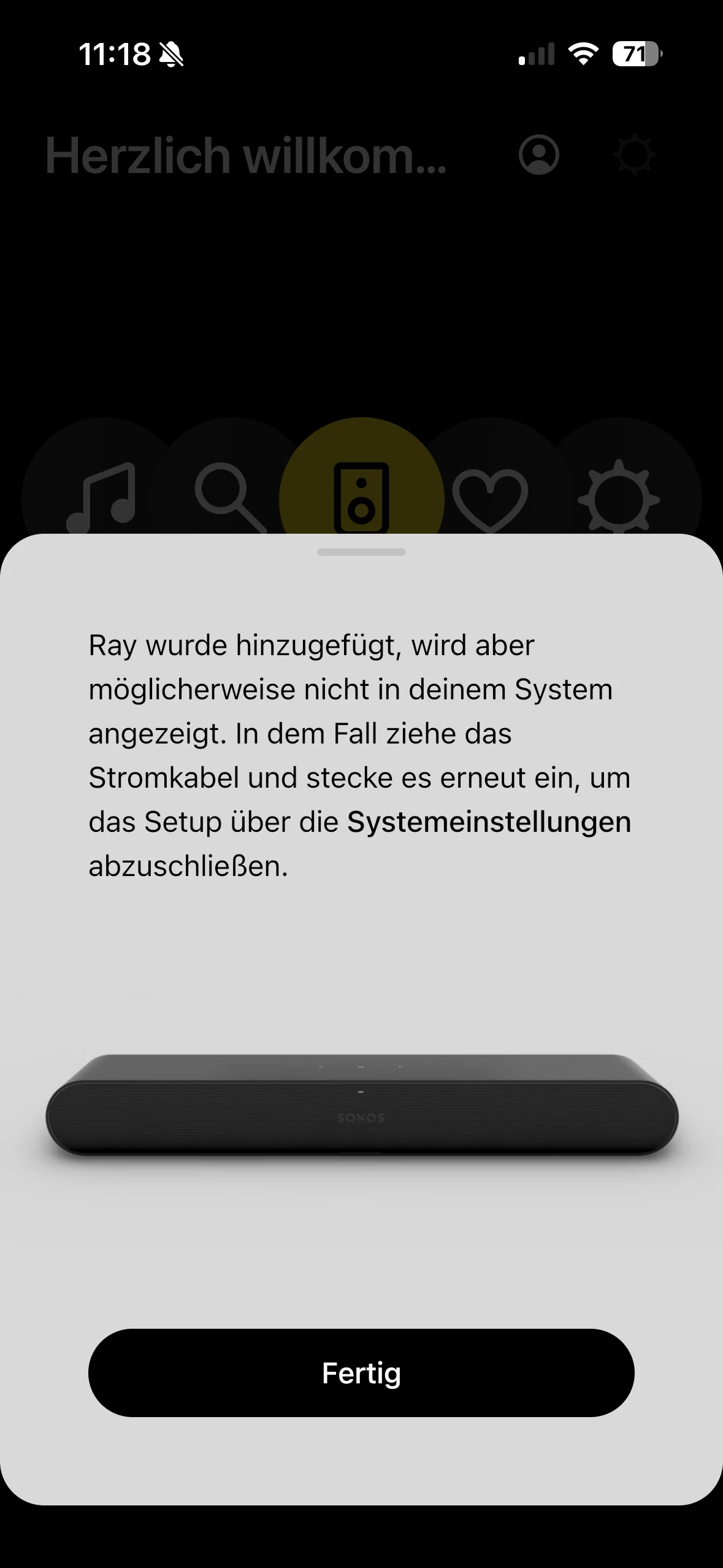 Nach vielen Versuchen gelingt es mir leider immer noch nicht meine Sonos Ray mit meinem iPhone zu verbinden. Ich erhalte die Nachricht in der App, dass die Koppelung erfolgreich war, mir wird aber das Gerät in der App nicht angezeigt. Neustart App, Router und Ray helfen nicht. Beim Versuch die Ray erneut zu koppeln, schlägt dies fehl (ich nehme daher an, dass es eigentlich geklappt hat, aber nicht sichtbar ist). Hat jemand Erfahrung damit?