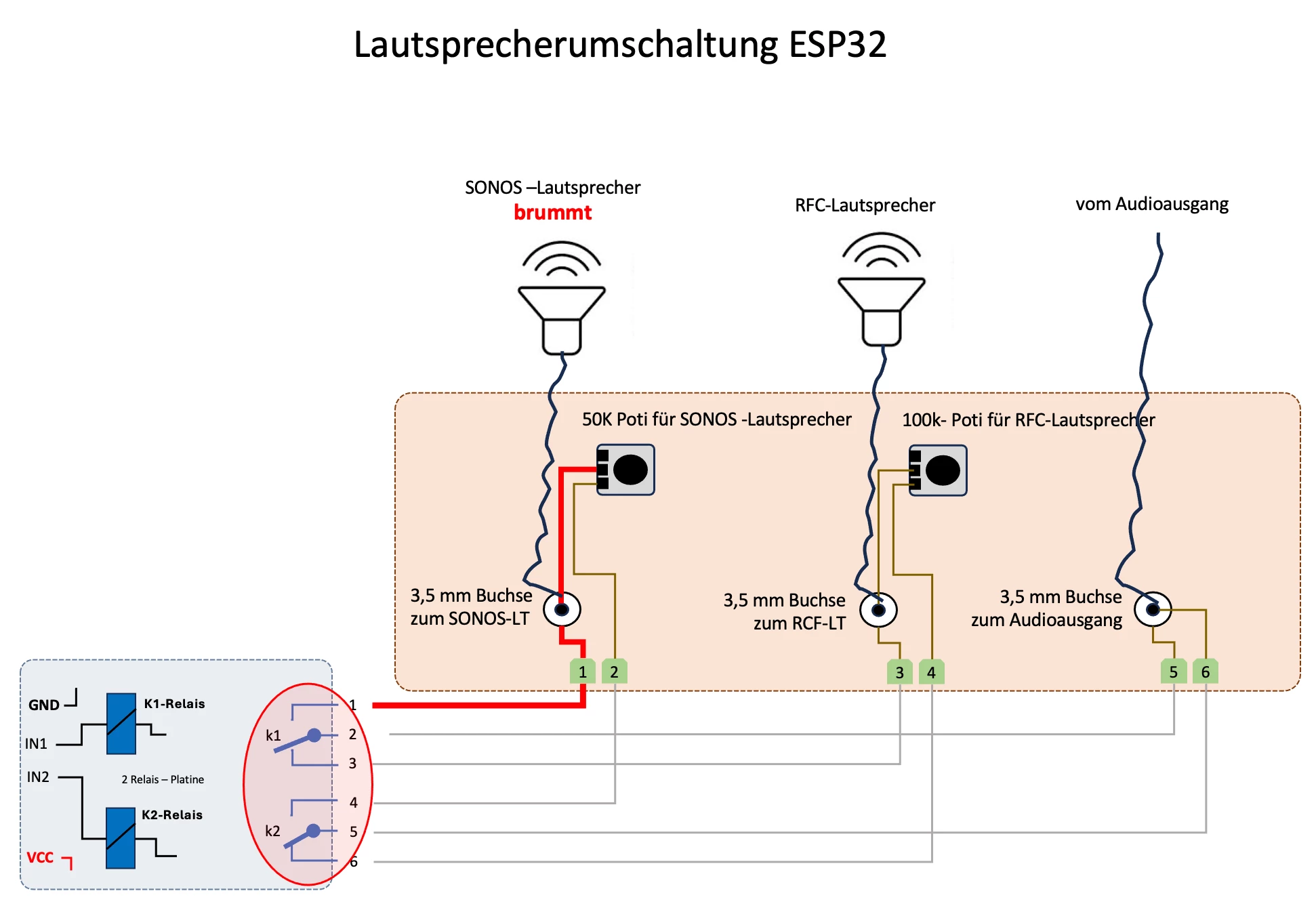 Ist der Sonos Eingang am Play5 aber offen (Relais hat auf anderen Lautsprecher umgeschaltet), brummt der Play5 sehr laut. Ist nur das 3,5 mm Kabel einseitig am Play5 gesteckt, kein brummen, kommt vorne an die Kontakte brummt es ebenfalls. Es reichen also ein paar Zentimeter( 4-6 cm) die vom gesteckten 3,5mm Kabel zum Relaiskontakt gehen, schon brummt es.